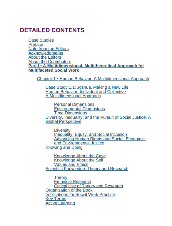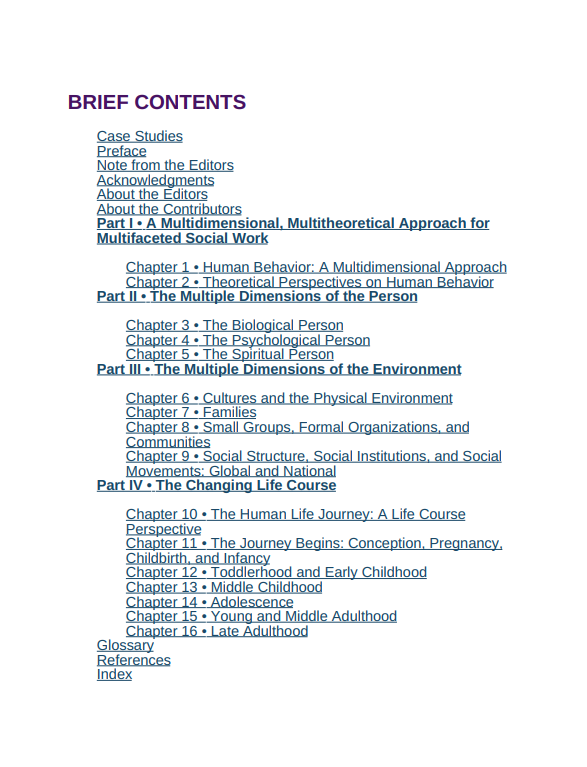 By integrating theory, research, and practice examples, the book provides readers with a comprehensive understanding of the multiple factors that shape human behavior. It equips students, practitioners, and researchers in the field of social work with the knowledge and tools to effectively assess, intervene, and advocate for individuals and communities within a person-environment-life course framework.
